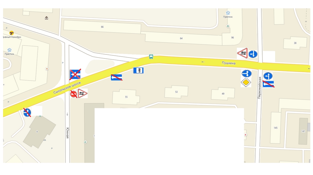 в прямом направлении: Сысольское шоссе – Пушкинский проезд – ул. Пушкинаул. Маркова – далее по маршруту;